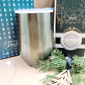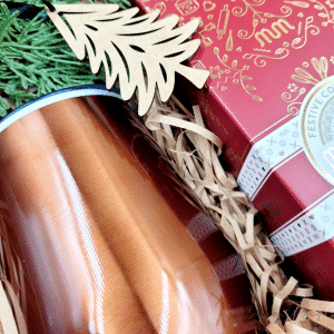 Including a stylish, reusable double-walled tumbler, a decadent box of Festive biscuits and a wooden tree decoration, this treat box is presented in a kraft box with a festive print, making it gift-ready and gorgeous!
