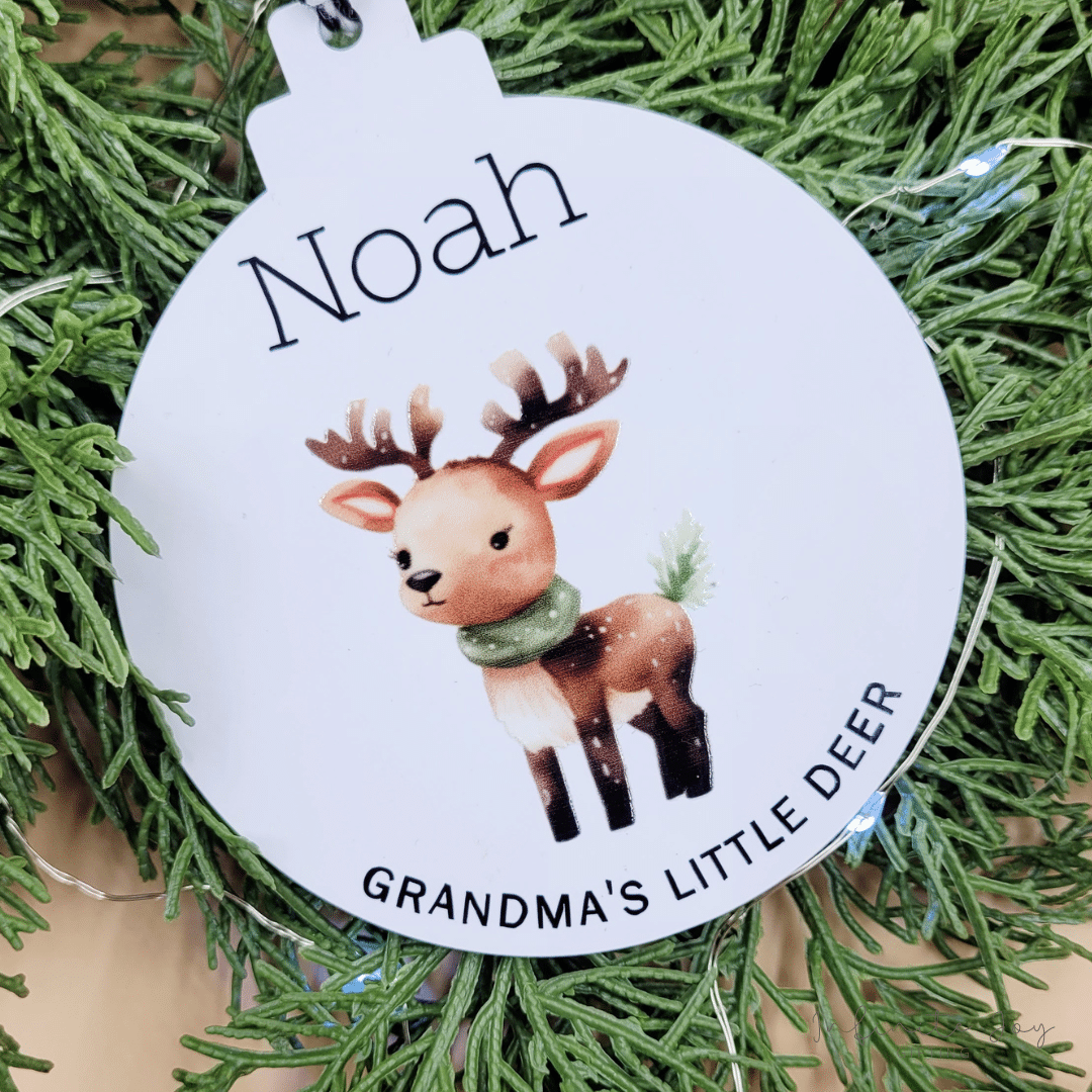 Add a touch of warmth and personalisation to your holiday decor with our “Little Deer” acrylic tree decoration. Crafted from 90mm diametre white acrylic, including UV print and vinyl personalisation, it’s perfect for honouring grandma’s (or mom / dad or other)’s love for their little ones and will become a treasured item for years to come!