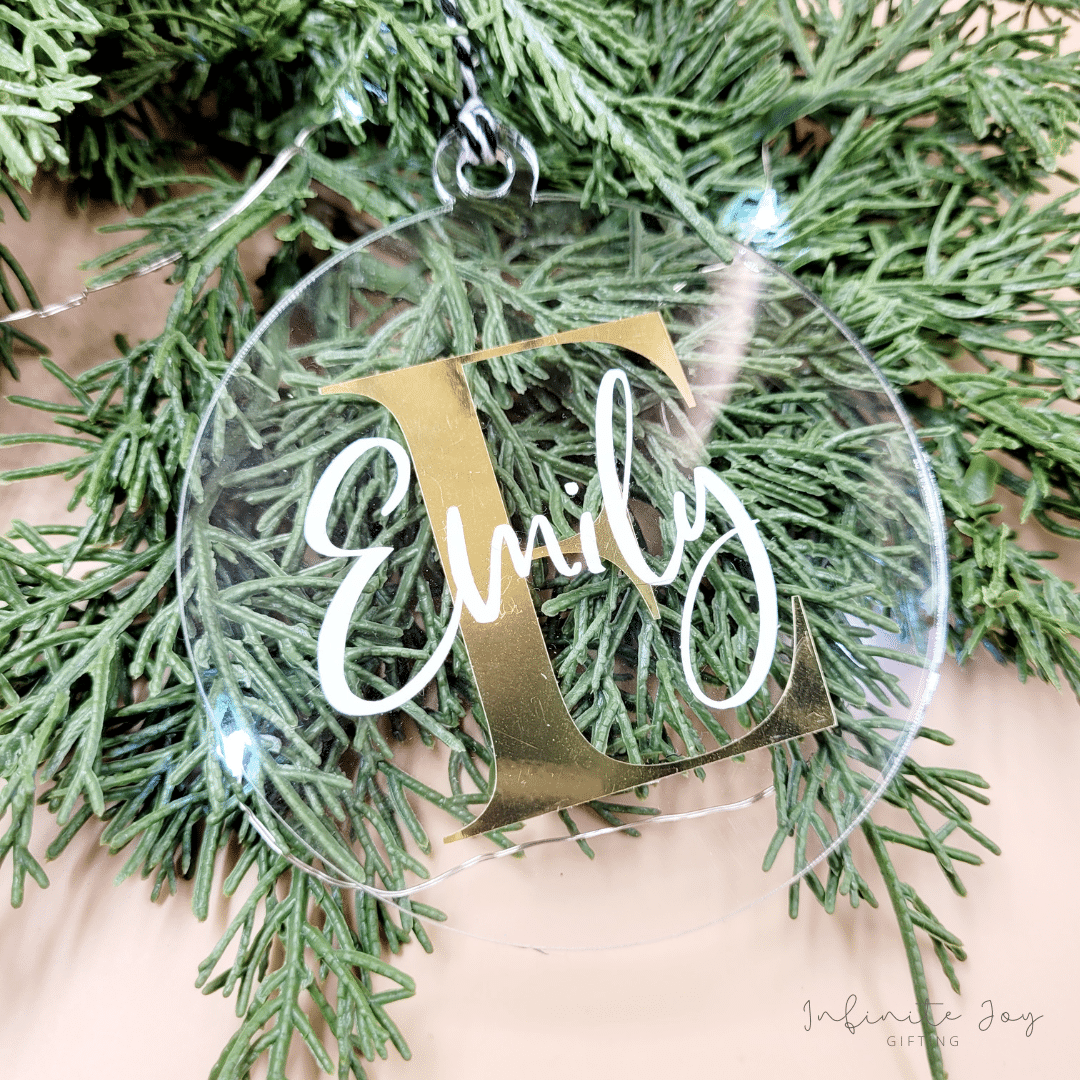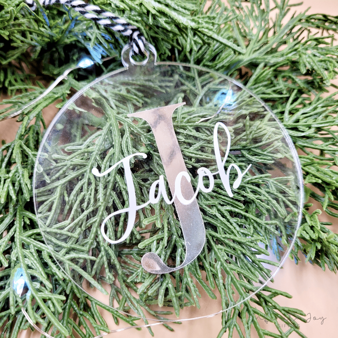 Add a personal touch to your holiday decorations with our elegant monogram tree decoration. Crafted from high-quality clear acrylic with chrome vinyl personalisation, this ornament is designed in a sleek, minimalist style featuring a single initial together with name. Perfect for families, couples or individuals, it adds a custom touch to any Christmas tree.