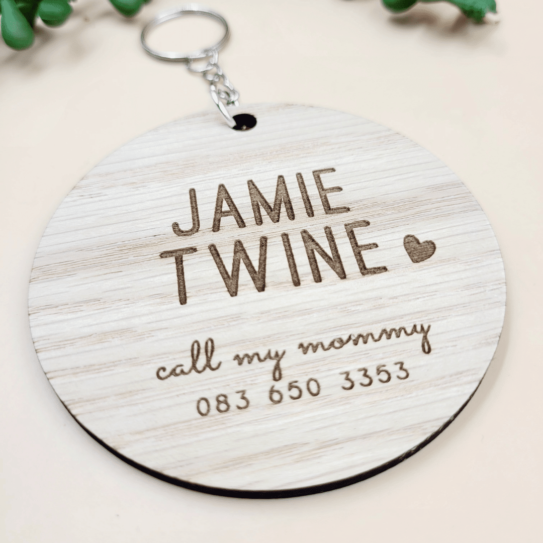 Never lose your bag again! Personalised 80mm diameter veneer bag tag, including parent’s name or number.