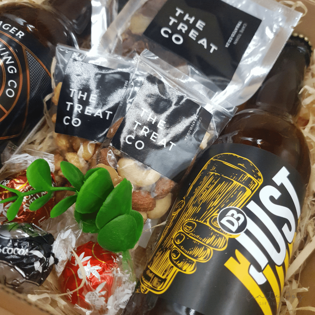 2 x Craft Beers, 30g biltong, 40g droewors and delicious honey roasted peanuts, together with Lindor choccies, packaged in a hamper box together with ribbon and tag. Gift ready.