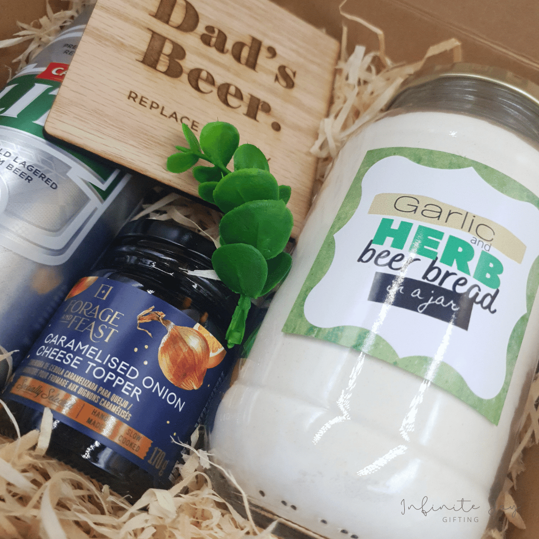 Ready for baking THE MOST DELICIOUS beer bread. Bread premix, together with beer, caramelised onion topping and a wooden coaster. Presented in a kraft hamper box with twine and a gift tag. Choose from Cheese & Onion beer bread or Garlic & Herb beer bread.