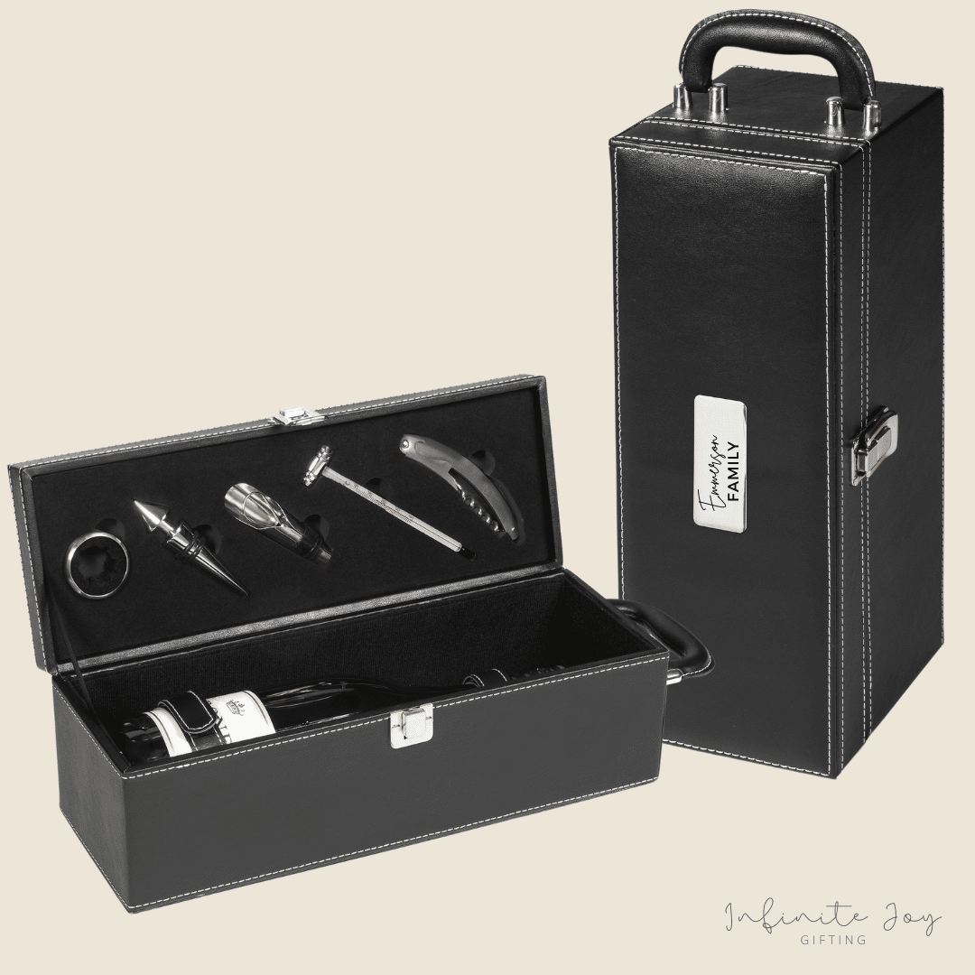 Leatherette box has contrast stitching and a sturdy carry handle.