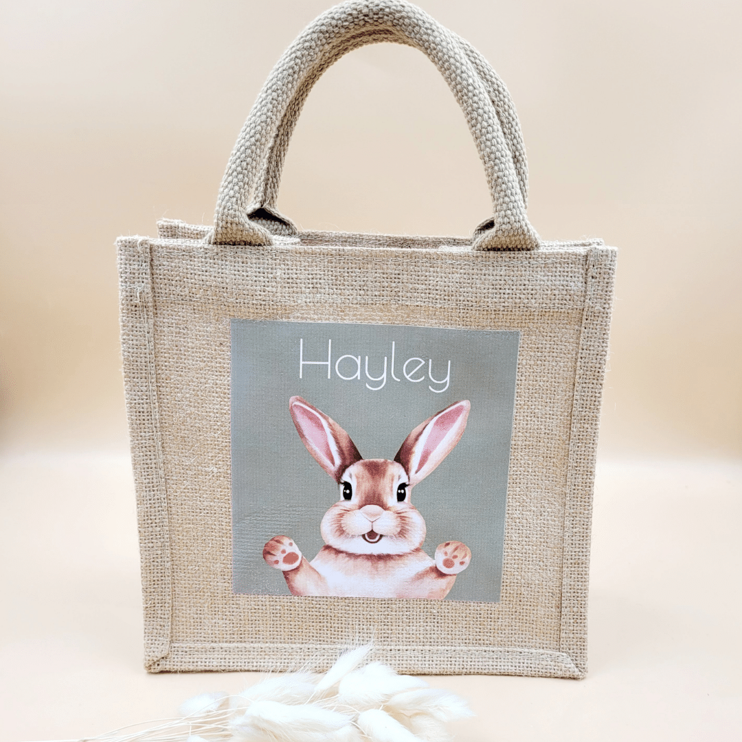 - Design: Adorable bunny design printed on the front, with jute handles for easy carrying