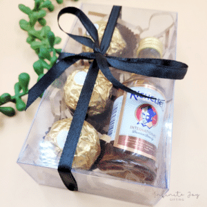 Perfect to add to any celebration… Father’s Day, birthdays, wedding favours, etc. PVC plastic box (75mm x 135mm x 35mm in size) including 3 x Ferrero Rocher and either a Whiskey or Brandy mini.