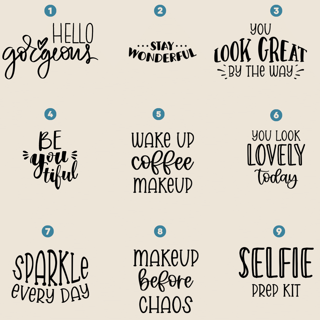 | Choose Type | Hello gorgeous, Stay wonderful, You Look Great, BeYOUtiful, Wake up, You look lovely, Sparkle, Make Up Before Chaos, Selfie Prep Kit |