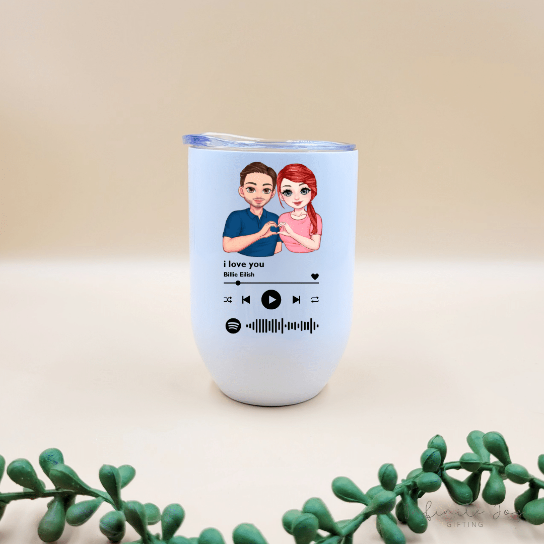 Choose from various drinkware and we will print it, together with your custom couple character and the Spotify code link to your favourite song.