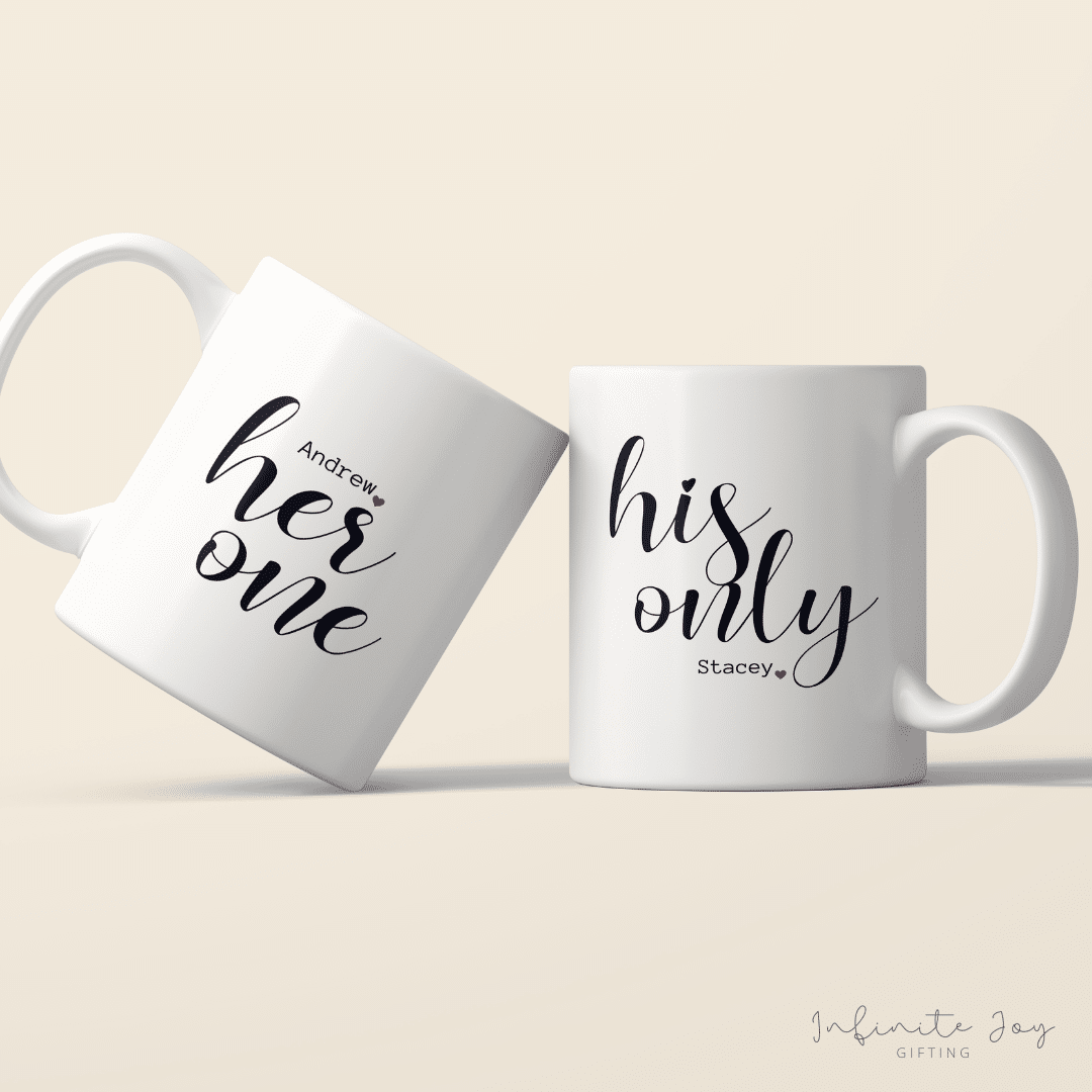 Set of two personalised ceramic mugs. Choose from one of our designs, or ask us to create a personalised one just for you by adding a comment in the notes field at check out.