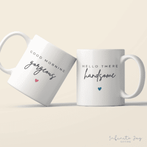 Set of two personalised ceramic mugs. Choose from one of our designs, or ask us to create a personalised one just for you by adding a comment in the notes field at check out.