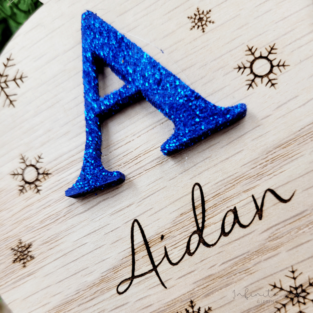 Add a touch of sparkle to your holiday decor with our glitter tree ornaments. This dazzling decoration is crafted from 3mm veneer wood with a hand painted and glittered monogram letter which will catch the light beautifully on your Christmas tree.