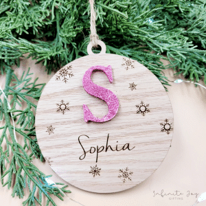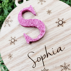 Add a touch of sparkle to your holiday decor with our glitter tree ornaments. This dazzling decoration is crafted from 3mm veneer wood with a hand painted and glittered monogram letter which will catch the light beautifully on your Christmas tree.