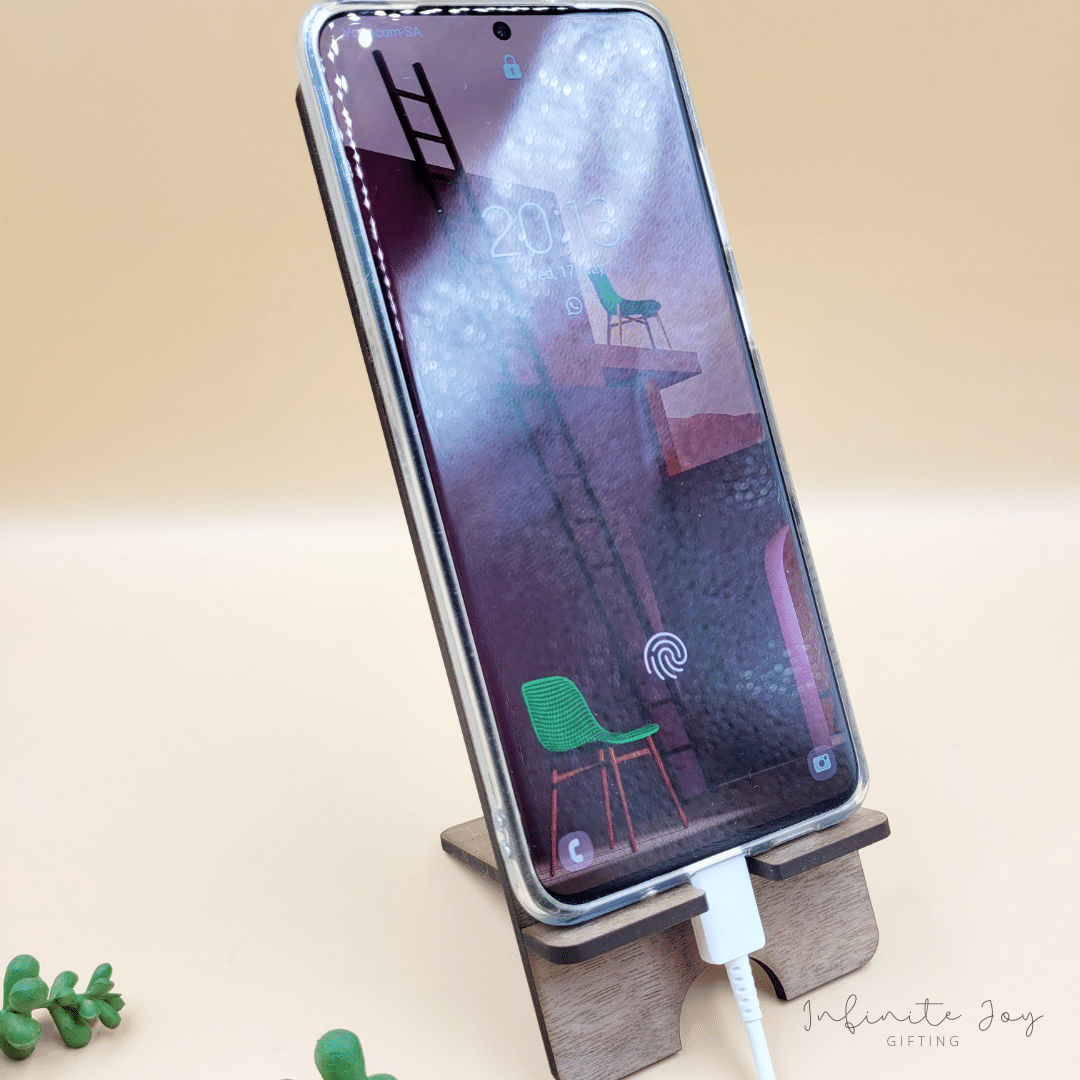Mobile phone stand, made from walnut veneer wood, laser engraved with personalised message.