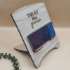 Mobile phone stand, made from walnut veneer wood, laser engraved with personalised message.