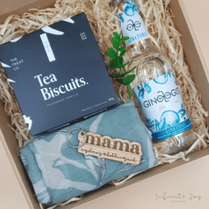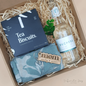 Scarf, G&T (alcoholic or non-alcoholic variant), biscuits and a personalised MOM/MAMA keyring. (scarf colour and pattern may vary)