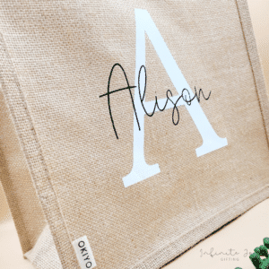 The high-quality Jute shopping bag is the perfect reusable eco-friendly bag ideal for grocery shopping or for use as a gift bag for that special occasion. It features durable laminated Jute fabric and cotton webbing rope handles, with vinyl personalisation on the front.