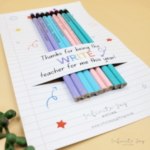 Add a thoughtful touch to your teacher’s desk with beautifully crafted pencils. This set consists of of 8 pastel pencils, perfectly laser engraved and personalised with teacher name (x2 pencils) and other teacher sayings. Packaged on a printed card.