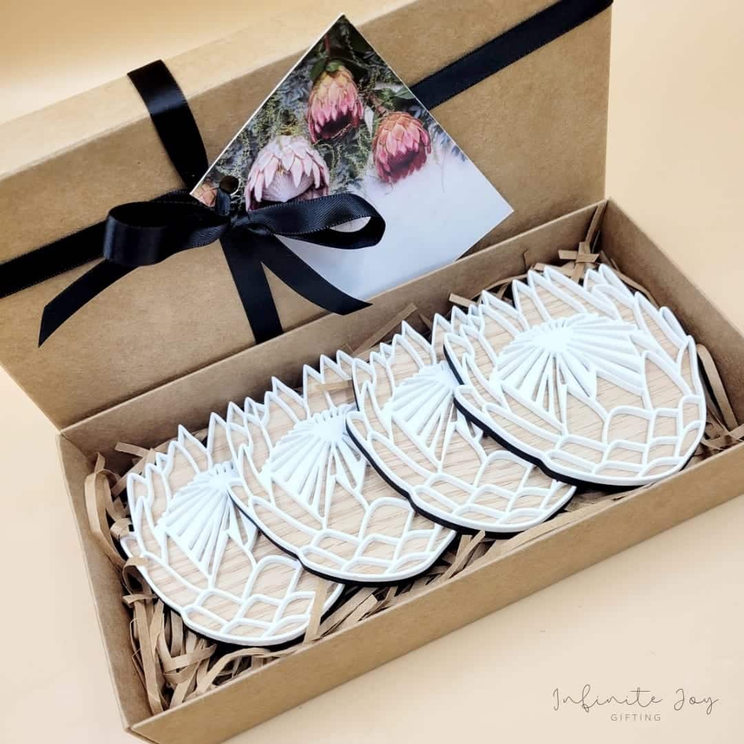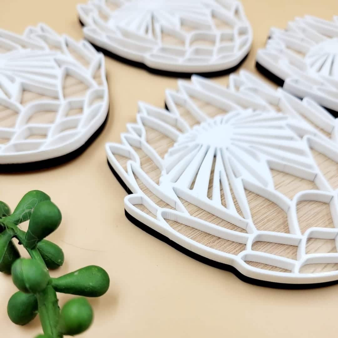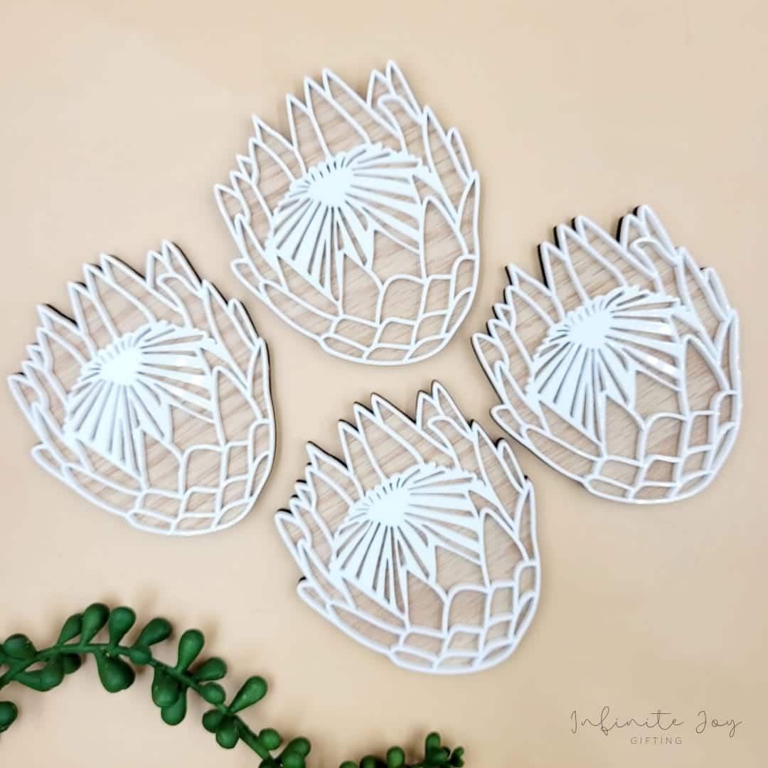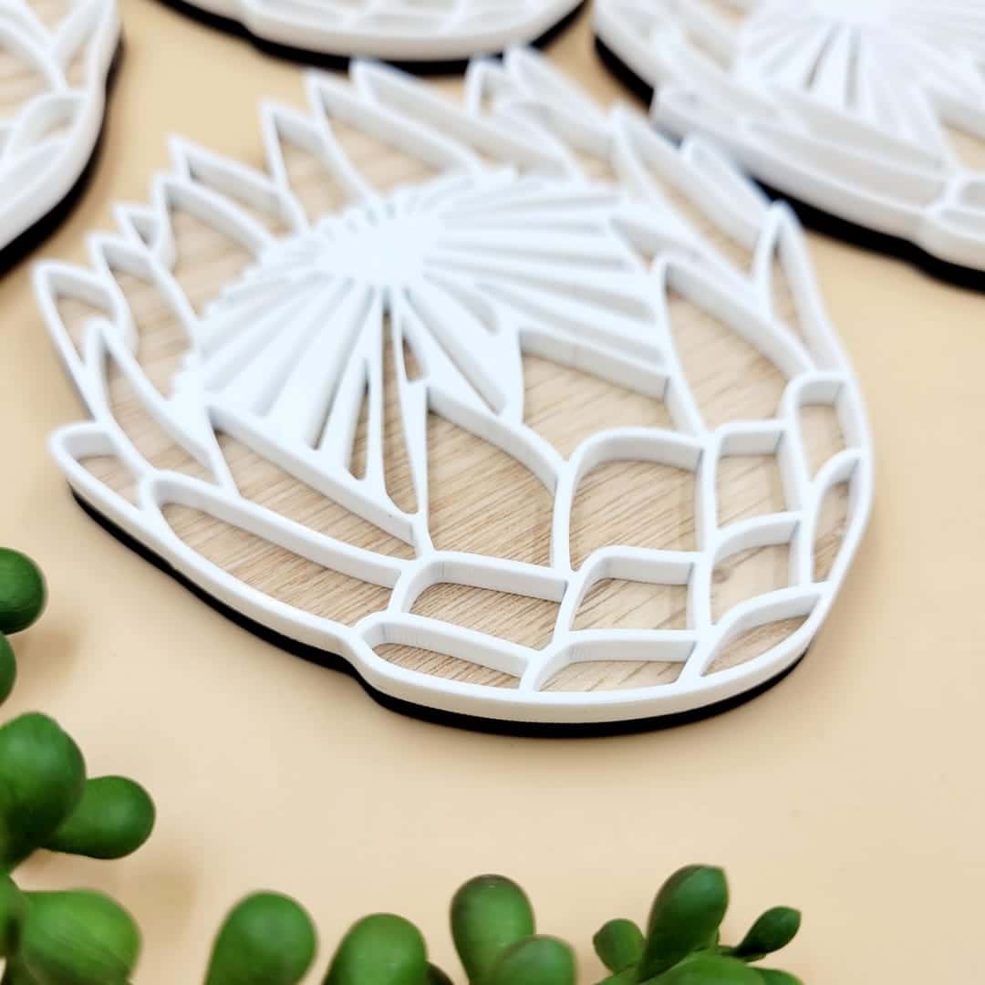 Inspired by the iconic South African protea flower, our Protea Coasters bring a touch of elegance and local charm to your space. Each coaster is precision-cut in a beautiful protea shape and layered with natural wood and glossy acrylic to create a stunning 3D effect.
