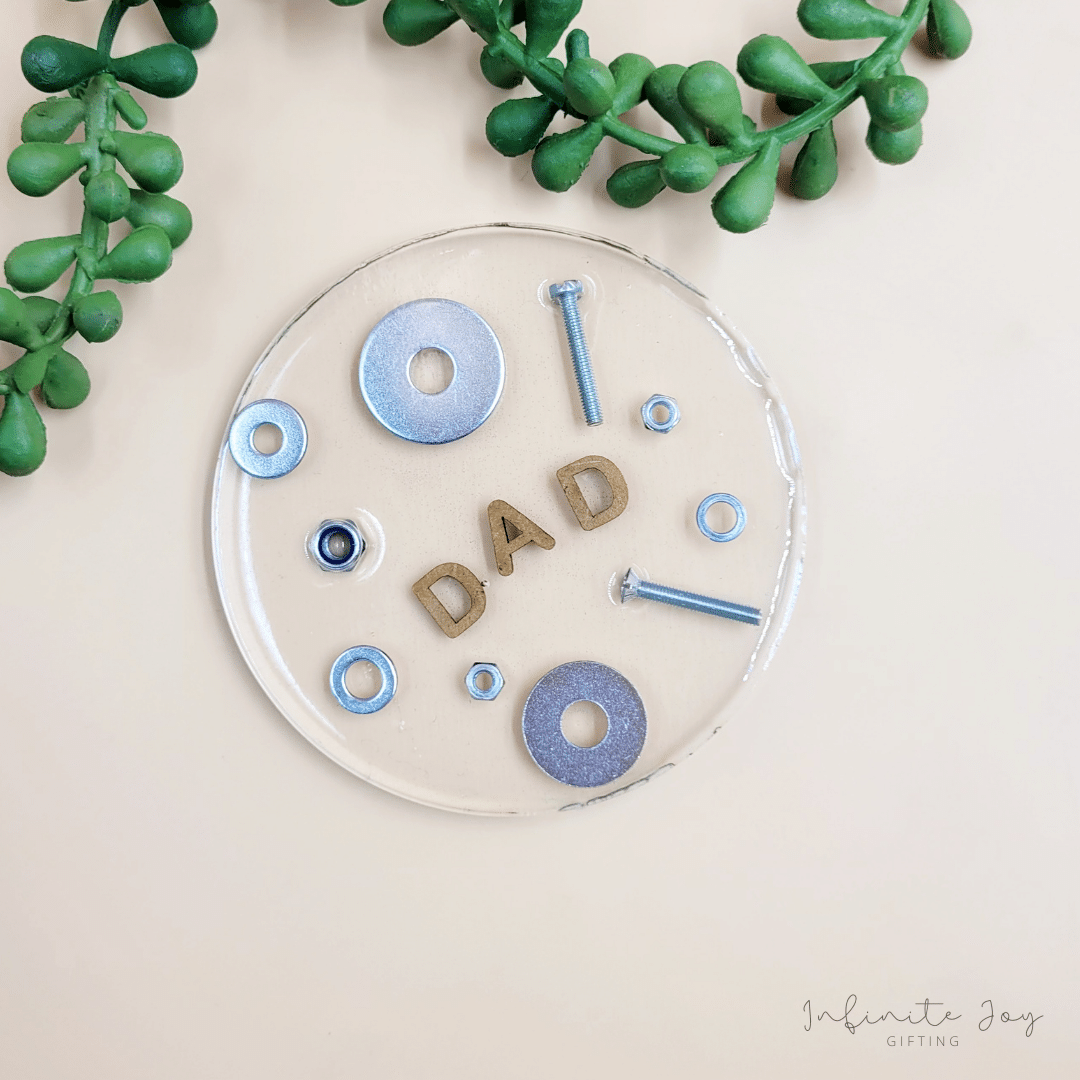 85mm diametre clear resin coaster, filled with nuts and bolts and your choice of “Scrabble” wooden letters or cut out wooden letters.