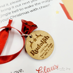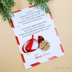 Create a magical Christmas surprise with Rudolph’s lost collar. This charming wooden collar tag, engraved and including a quaint bell, it is a unique holiday keepsake for kids to find on Christmas morning. “Dropped” by Rudolph during his travels, this collar is a delightful touch that adds wonder and excitement to the holiday season.