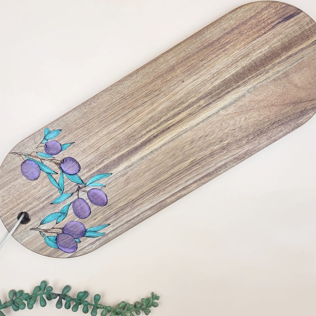 Acacia wood serving platter, laser engraved and handpainted with a lemon or olive design. These boards make beautiful gifts for any occasion!