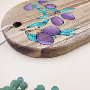 Acacia wood serving platter, laser engraved and handpainted with a lemon or olive design. These boards make beautiful gifts for any occasion!