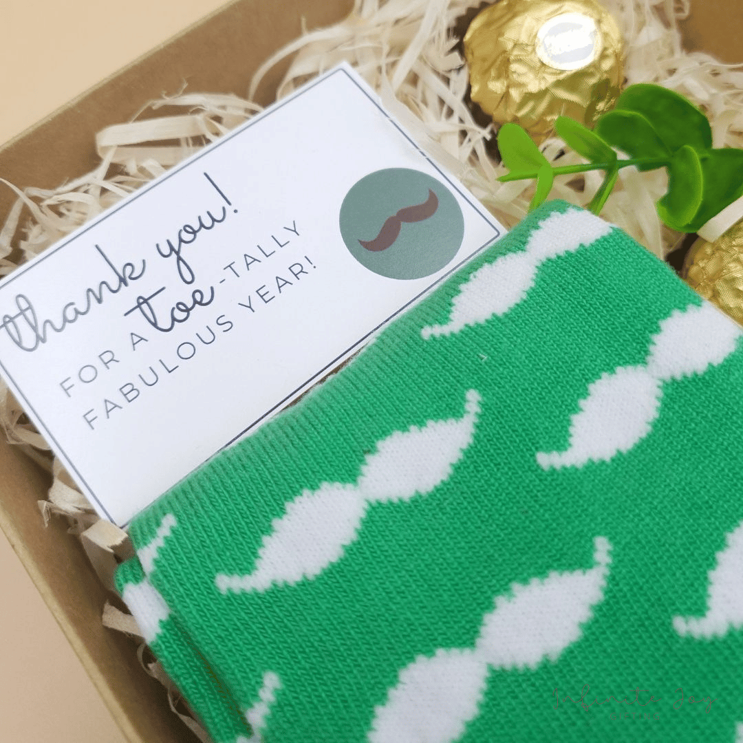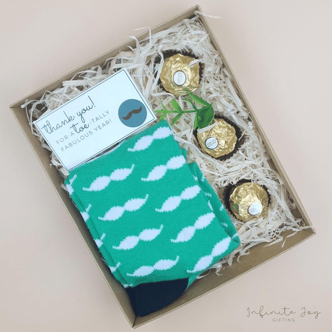 Cute mustache socks and 3 x Ferrero Rocher chocolates in a kraft box with a gift tag.