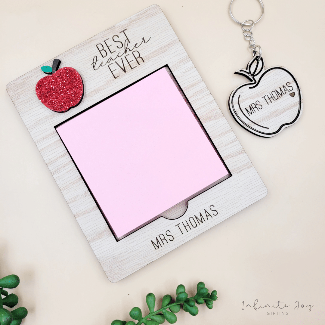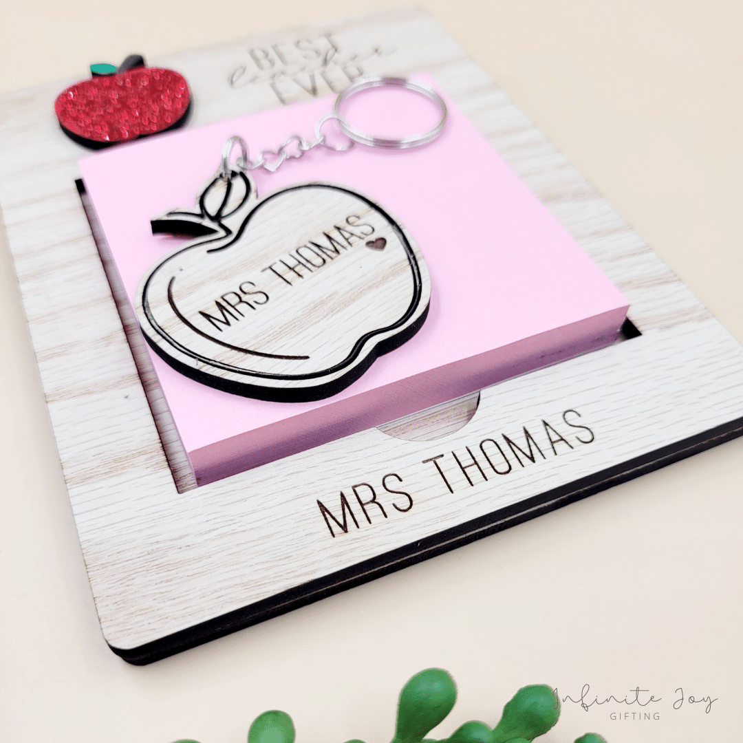 Sticky Note holder is a double layered veneer wooden holder, laser engraved with teacher’s name and including a handpainted glitter apple. Size: 110 x 140mm. Including laser engraved apple keyring, personalised with teacher’s name, plus 1 x pack of sticky notes.