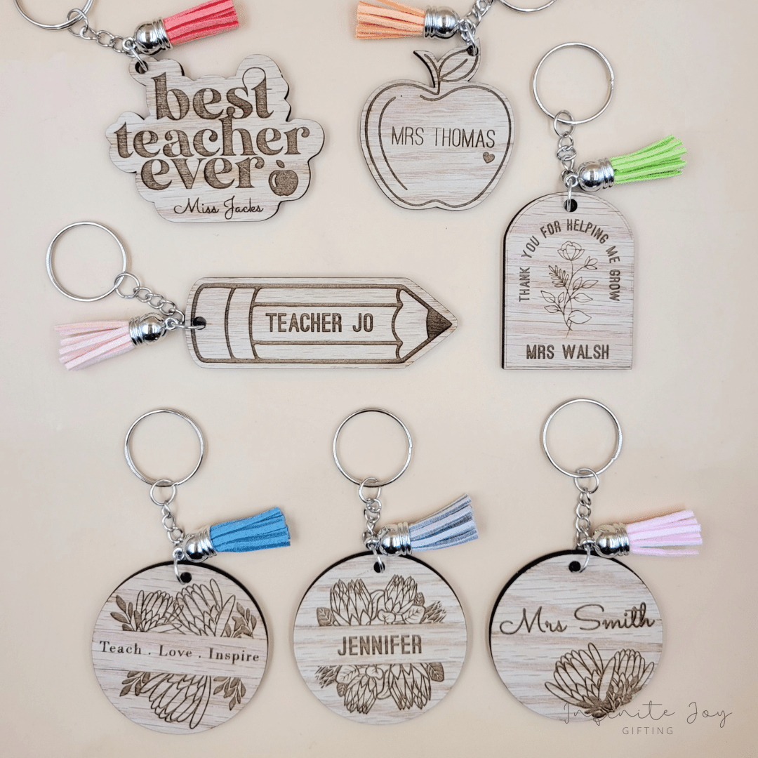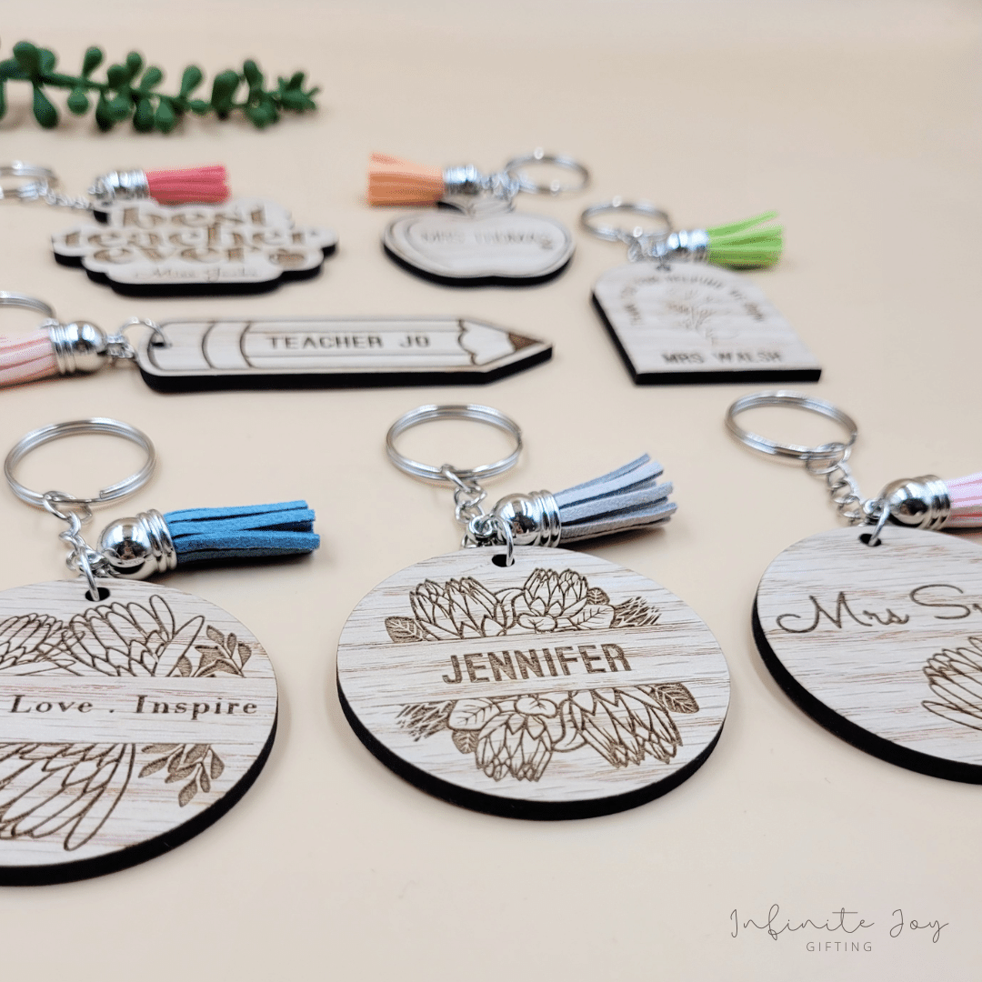 Perfectly personalised and a great reminder of your most wonderful teacher! Wooden veneer keyring with laser engraving and tassel. Size 55mm (for the round keyrings) / 65x45mm (Best Teacher) / 80x30mm (pencil)