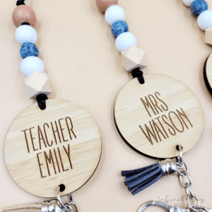 Personalised lanyard with wooden disk (55mm diametre), and wooden beads plus keyring, clip and tassel.