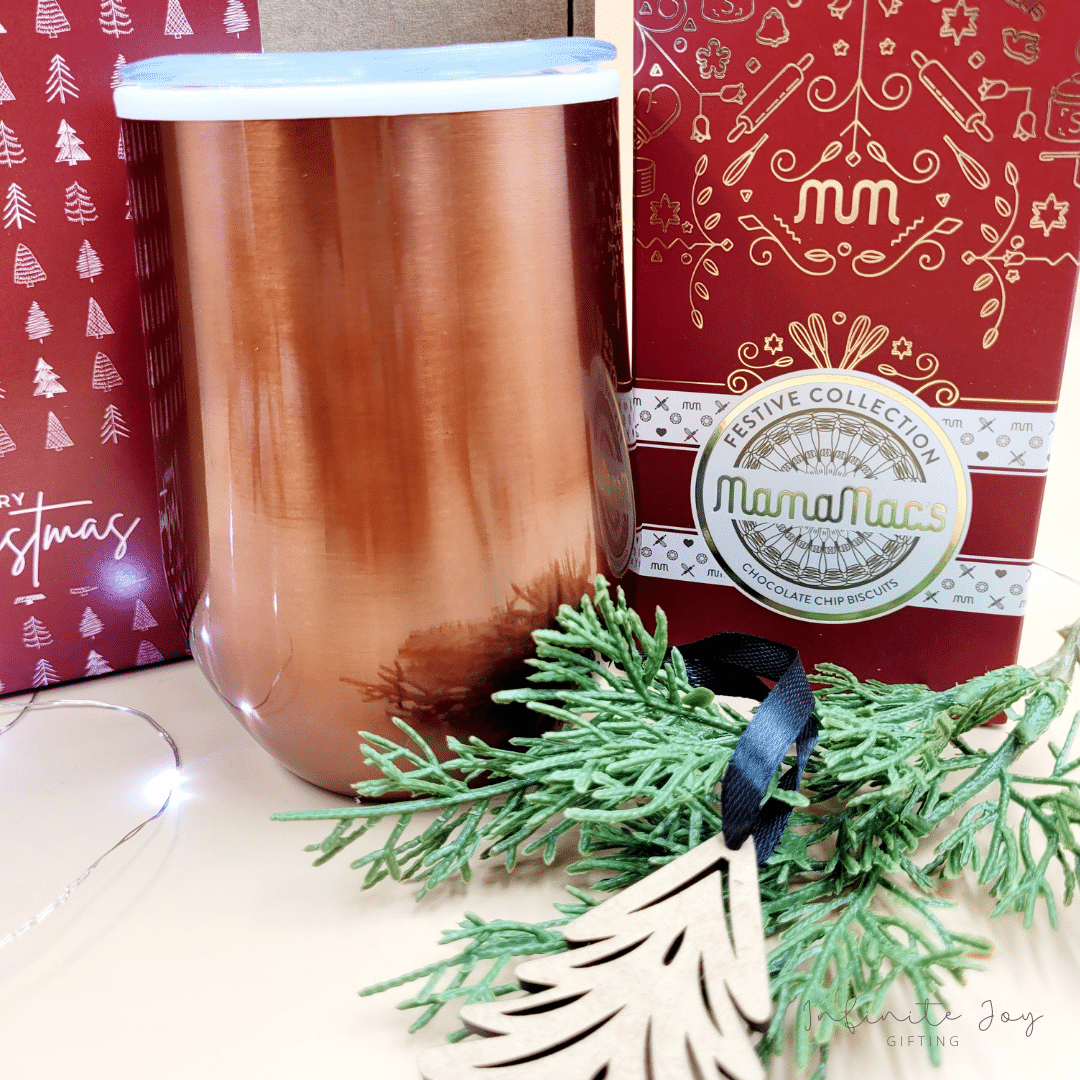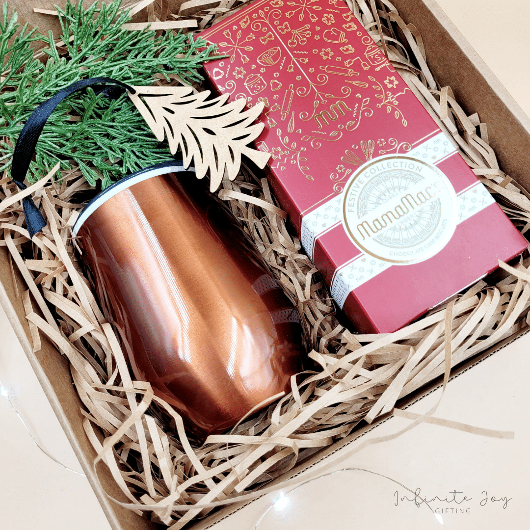 Including a stylish, reusable double-walled tumbler, a decadent box of Festive biscuits and a wooden tree decoration, this treat box is presented in a kraft box with a festive print, making it gift-ready and gorgeous!