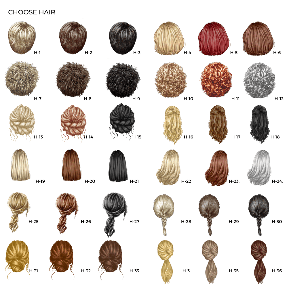 *Choose your skin tone, hair style&colour and indicate names for each, e.g. Mom H-32 T-8 P2, B-1, Jessica H-16 T-11 P-3, B-2