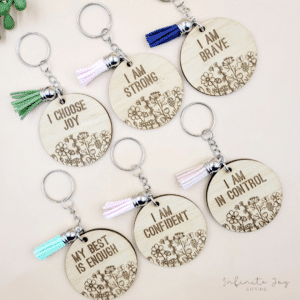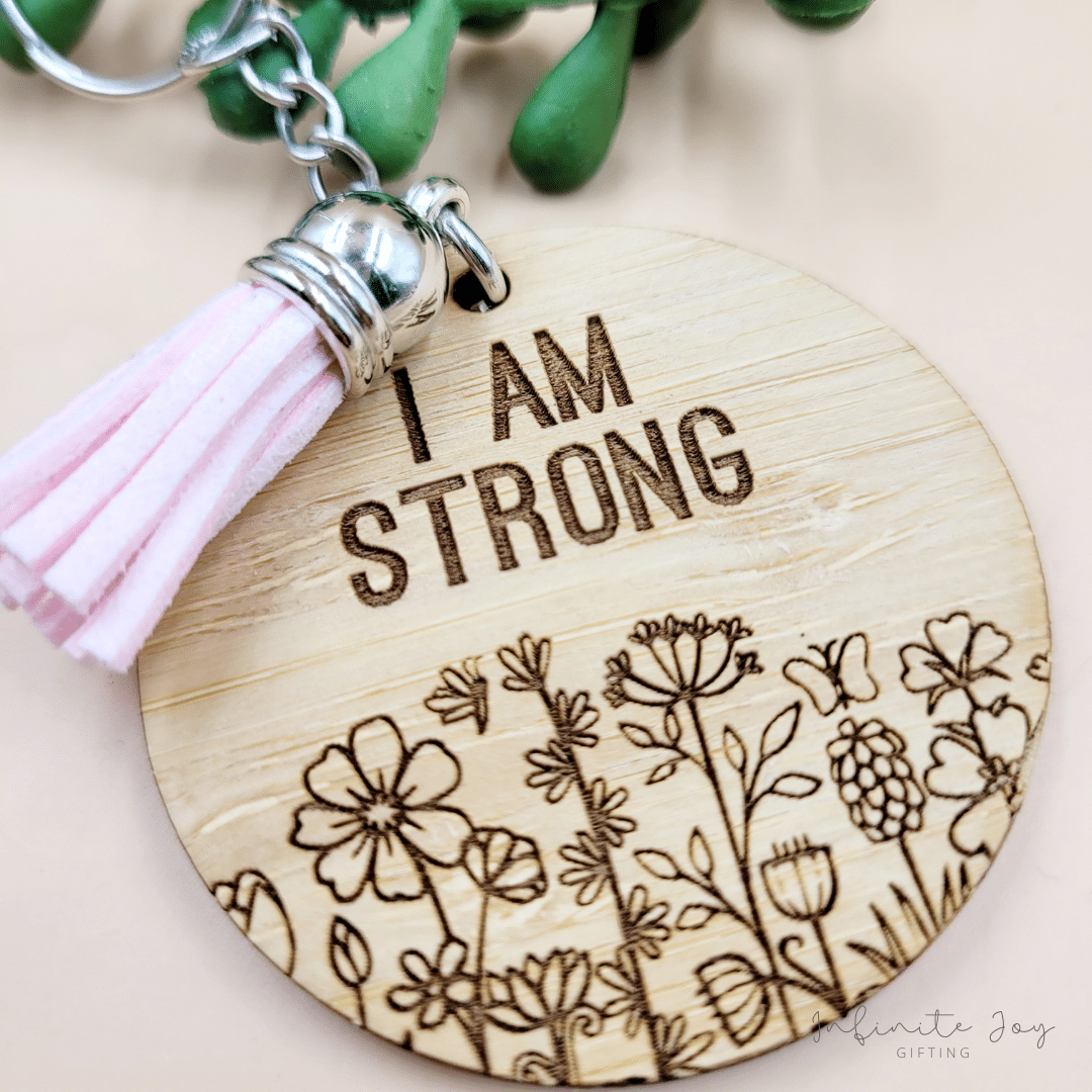 Round 50mm bamboo veneer keyring with laser engraving and tassel.
