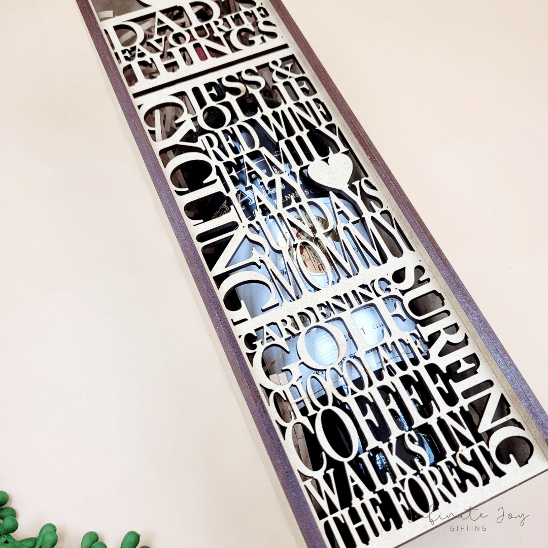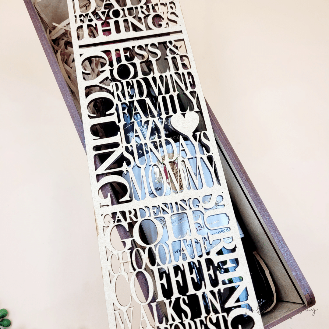 Custom Wooden wine box, cut out of 3mm MDF wood and designed to include Dad’s favourite things.